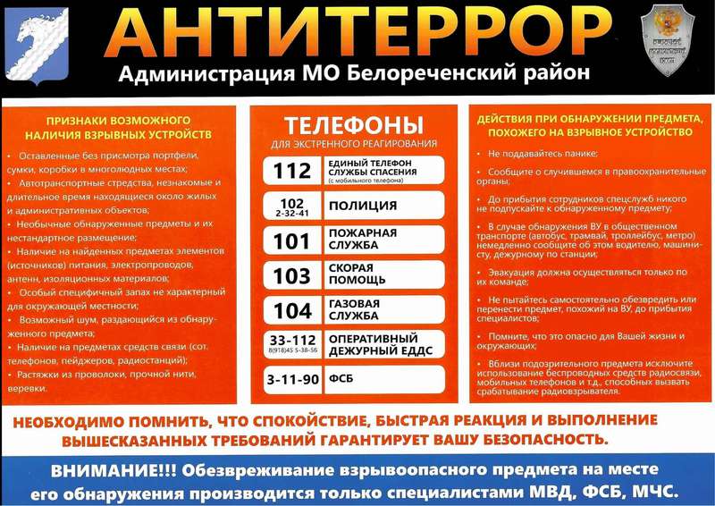 Антитеррористическая комиссия в муниципальном образовании Белореченский муниципальный район Краснодарского края предупреждает об ответственности за противоправные действия террористического характера.