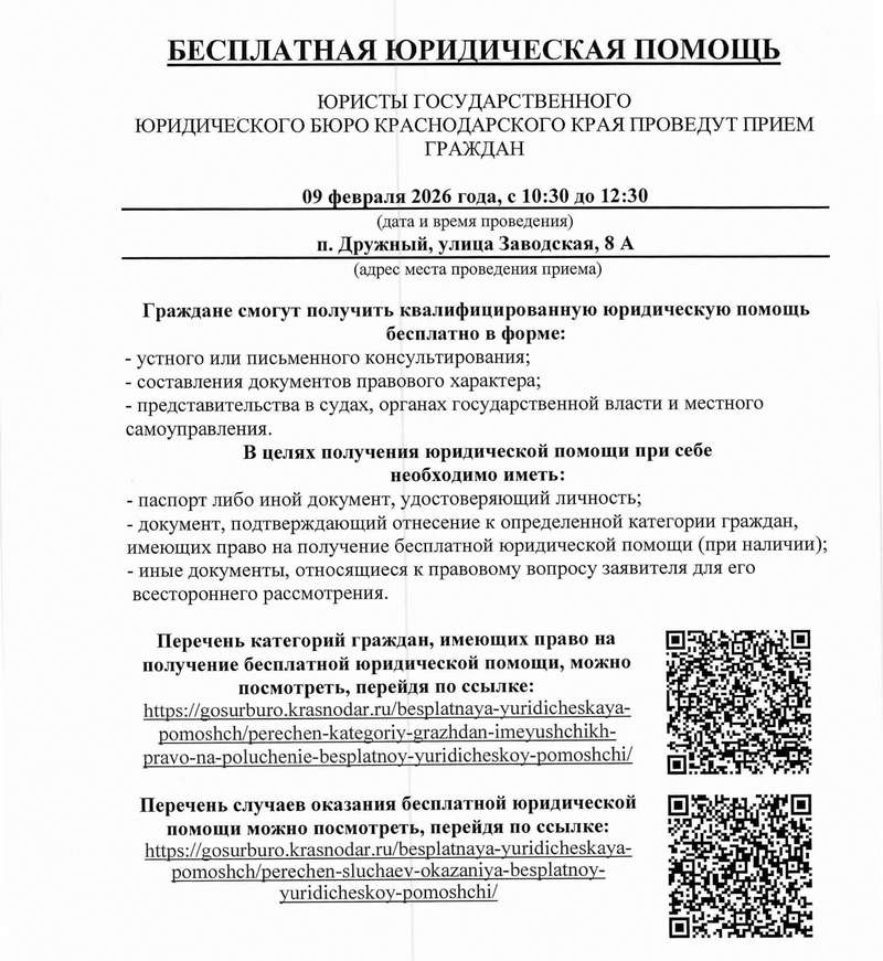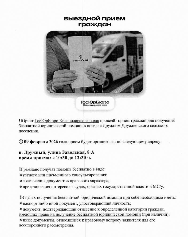 9 февраля 2026 года с 10:30 до 12:30 ч. ГКУ КК «Государственное юридическое бюро Краснодарского края» проведет выездной день оказания бесплатной юридической помощи